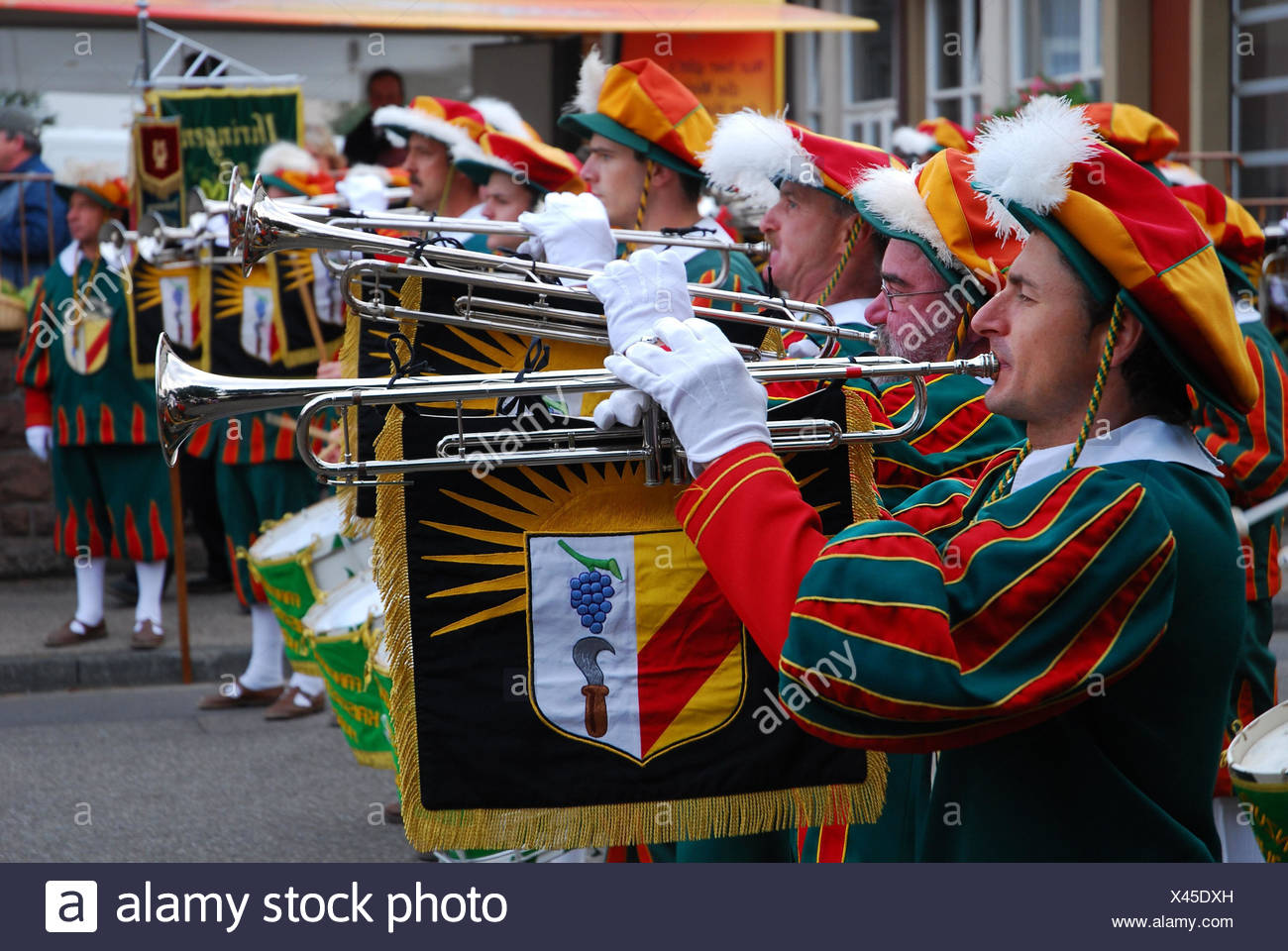 Germany Baden Wurttemberg Kaiserstuhl Ihringen Thanksgiving Day Fanfare Train Trumpet Player Play Southern Badens Economy Agriculture Viticulture Wine Growing Area Feast Solemnity Harvest Feast Procession Vintage Feast Personwww.alamy.com