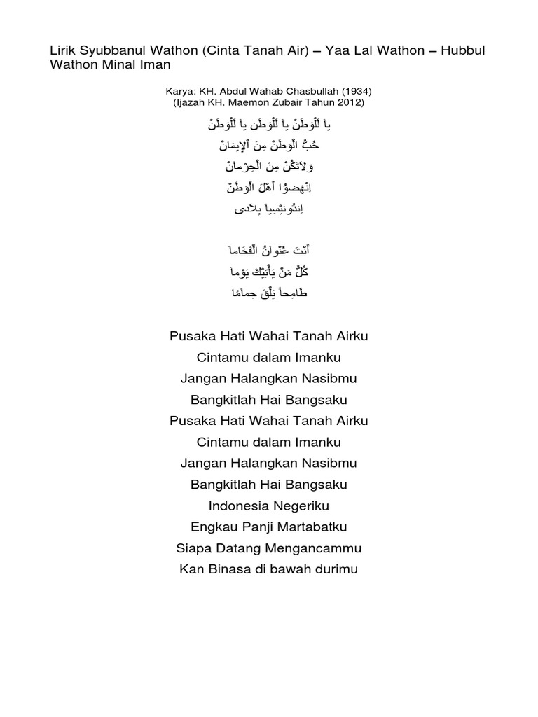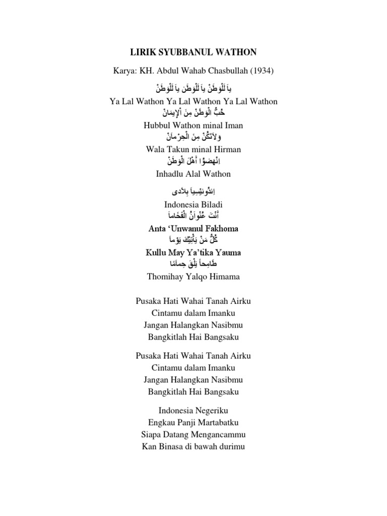 Lirik Syubbanul Wathon Cinta Tanah Air Yaa Lal Wathon Hubbul Wathon Minal Iman Blog Pecinta Sholawat